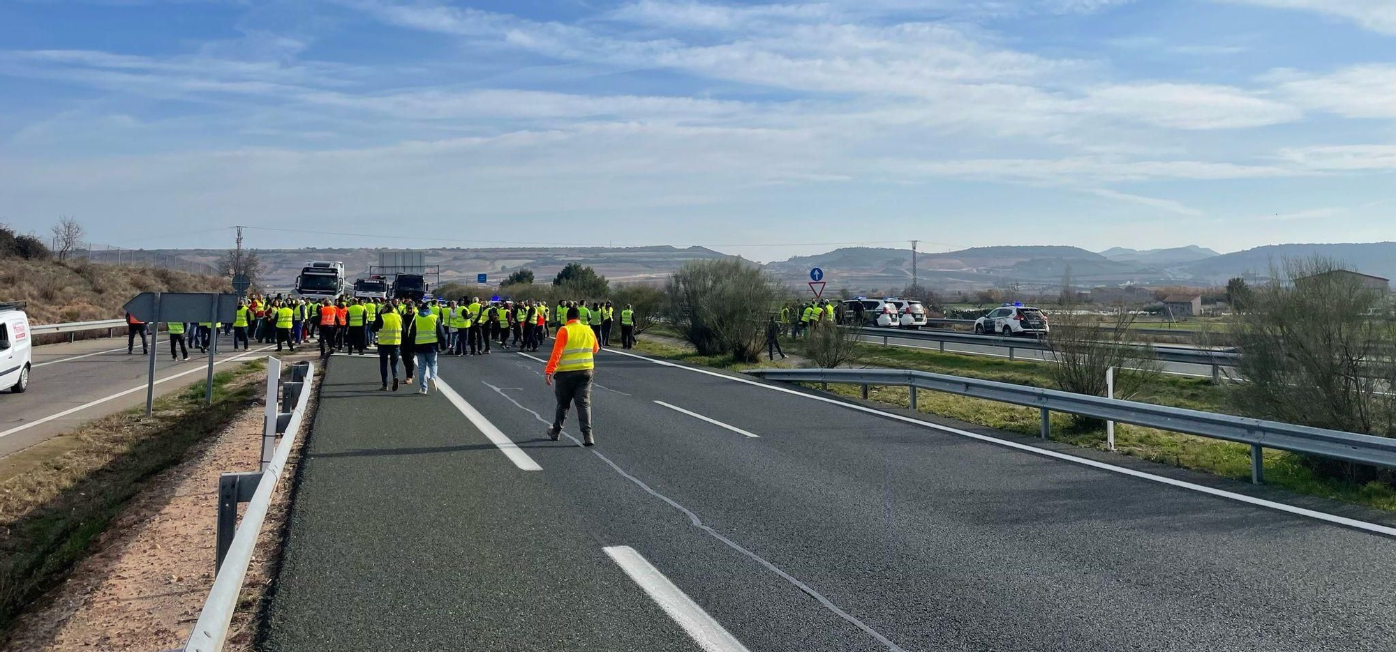 Un grupo de más 200 agricultores que estaba en la zona del polígono de Navarrete, se han bajado de sus tractores y han cortado la A-12 en ambos carriles esta zona. La UAGR de la Guardia Civil está interviniendo y no ha permitido que los tractores corten la autopista, por lo que los agricultores han decidido ponerse el chaleco amarillo, bajarse de los vehículos y cortar la A-12.