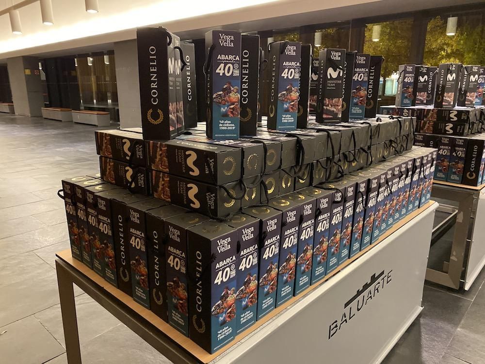 Los brindis estuvieron provistos del vino de Rioja Vega Vella Crianza, de las Bodegas Cornelio Dinastía, orgulloso patrocinador del equipo ciclista desde hace cuatro años, como muestra en la botella que incluye a Alejandro Valverde, “el bala”, en su etiqueta.