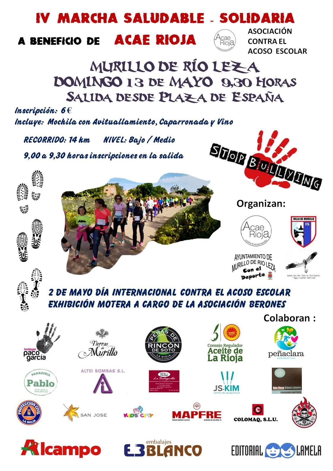Este domingo 13 de mayo, Murillo de Río Leza se ha volcado contra el ascoso escolar. Y es que la Asociación Deportiva Villa de Murillo ha organizado la IV Marcha Solidaria a beneficio de ACAE (Asociación contra el acoso escolar). Como ya informó Rioja2, la marcha costaba de 6 euros que serán destinados a dicha asociación que lucha por sacar el abuso de las aulas.