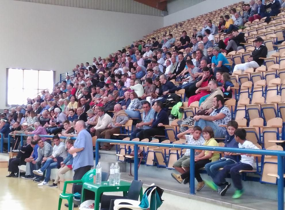 Algo más de media entrada en el espectacular frontón de Nájera, uno de los mejores para los espectadores a la hora de disfrutar de la pelota a mano. Bonito y festivo ambiente en la grada. Se acercaron a ver a sus compañeros los hermanos Merino, de Villar de Torre.