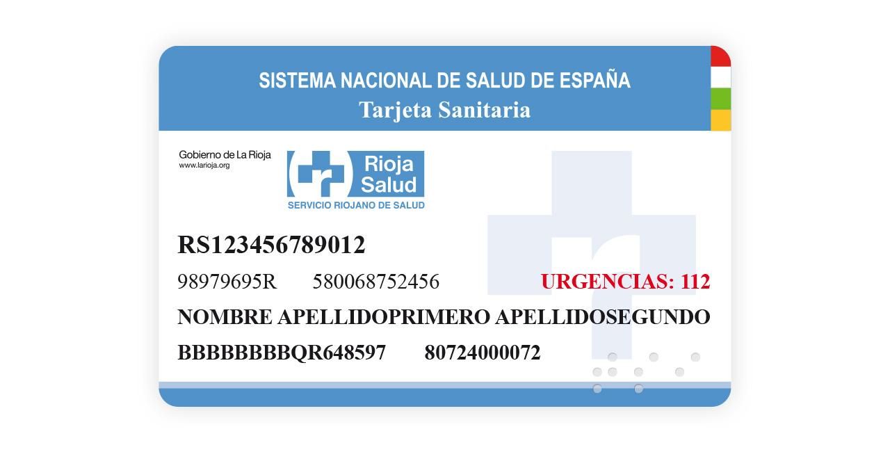 La nueva tarjeta sanitaria contiene en la parte superior del anverso el logotipo del Servicio Riojano de Salud y un rótulo que la identifica como un documento adscrito al Sistema Nacional de Salud. También en el anverso aparecen los datos básicos de identificación del titular de la tarjeta (nombre, apellidos y DNI), además incluye su número de seguridad social y el del servicio de salud emisor de la tarjeta. Incluye también dos códigos de identificación, correspondientes al número que asigna el Servicio Riojano de Salud a cada usuario y el código de identificación personal único que posee dentro del Sistema Nacional de Salud. La tarjeta dispone de sistema de lectura braille de los caracteres de las iniciales de la tarjeta sanitaria individual.