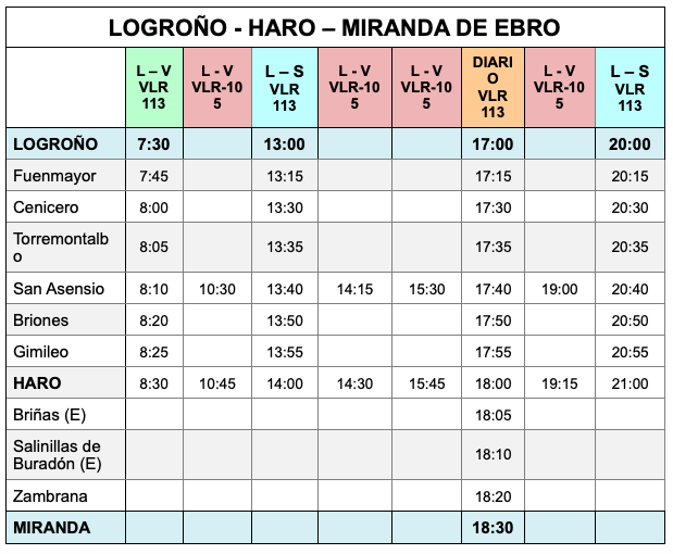 - Salida de San Asensio a las 8:10 h. y llegada a Haro a las 8:30 h., de lunes a viernes
