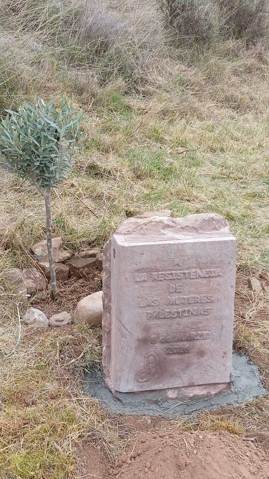 El olivo por las mujeres palestinas está acompañado de una inscripción grabada en piedra por la cantera Adriana Díaz, de Ojacastro, en la que se lee: “A la resistencia de las mujeres palestinas. 8 de marzo de 2026”. La placa también tiene esculpida una mariposa, pues tanto El Colletero como Adriana, colaboran con la iniciativa solidaria “El latido de las mariposas”, proyecto social y educativo que trabaja contra todas las violencias hacia las mujeres (https://latidomariposas.com/).