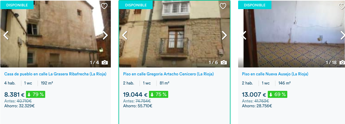 De hecho, en La Rioja se venden inmuebles en diversas localidades de La Rioja a precio muy ventajosos. Así, en la entidad bancaria ofrece un piso en Cenicero con un descuento del 75%, otro en Ausejo con un descuento del 69%. También se vende una casa de pueblo en Autol por algo más de 33.000 euros tras descontarle al precio anterior un 49%. En Leiva está a la venta una casa de pueblo que tras descontarle un 72% los interesados pueden convertirse en sus dueños abonando menos de 20.000 euros o un garaje en la calle la Cigüeña de Logroño con un descuento del 65%.