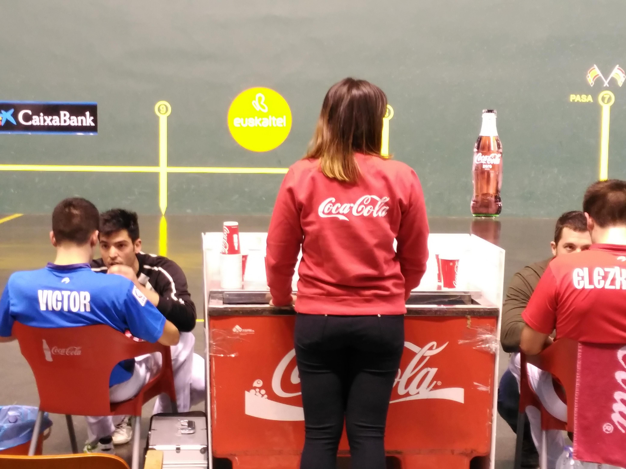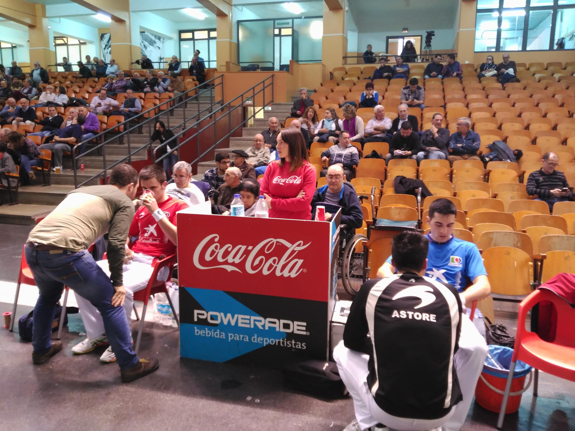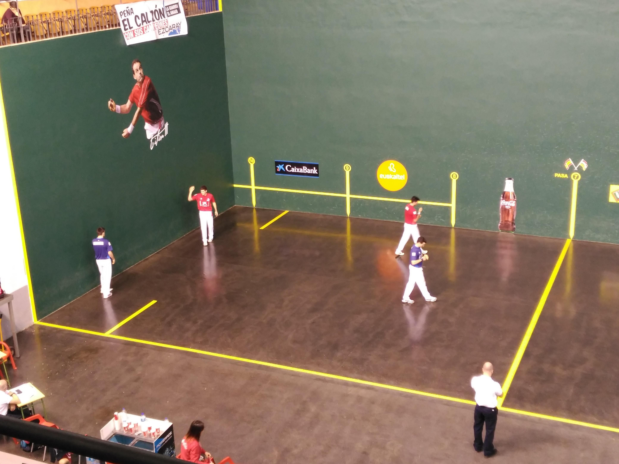 Durante este partido una pelota golpeó a una de las personas que ven el encuentro desde su silla de ruedas, detrás del lugar en el descansan los pelotaris. Quizá debería buscarse un lugar menos peligroso para colocarles.