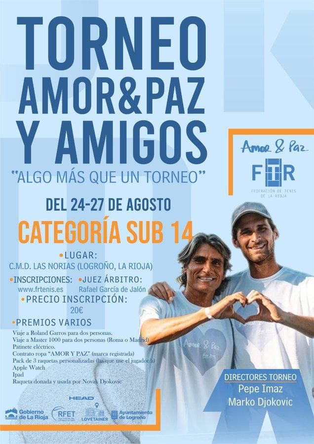 Ya están abiertas las inscripciones para el “Torneo Amor & Paz y Amigos” sub-14 (masculino y femenino) de tenis que se celebrará en Las Norias del 24 al 27 de agosto. Con el riojano Pepe Imaz y Marko Djokovic como directores del torneo, el evento pretende generar un ambiente deportivo y de amistad entre los jóvenes y, además, contará con grandes premios como un viaje para dos personas a Roland Garros.