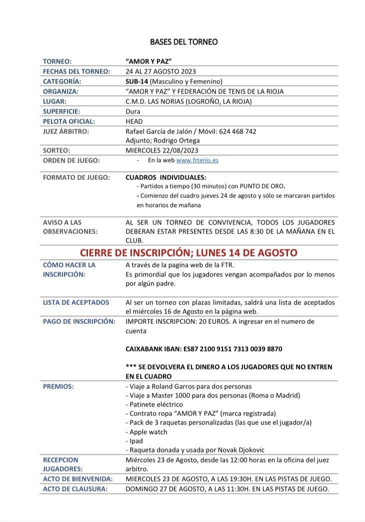 Para inscribirse hay que hacerlo a través de la web de la Federación de Tenis de La Rioja: https://www.frtenis.es/torneo-amor-y-paz-ftr/. La cuota es de 20 euros y hay plazas limitadas (32 chicos y 32 chicas), por lo que a los niños y niñas que no entren en la lista de aceptados (miércoles 16 de agosto en la web de la Federación), se les devolverá el dinero. El cierre de inscripciones está fijado para el 14 de agosto.