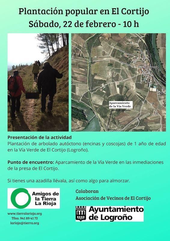 Este sábado 22 de febrero a las 10 horas Amigos de la Tierra La Rioja, con la colaboración de la Asociación de Vecinos El Cortijo y el Ayuntamiento de Logroño, llevará a cabo la plantación de 100 encinas y 100 coscojas de una savia (1 año) en la Vía Verde del Cortijo.