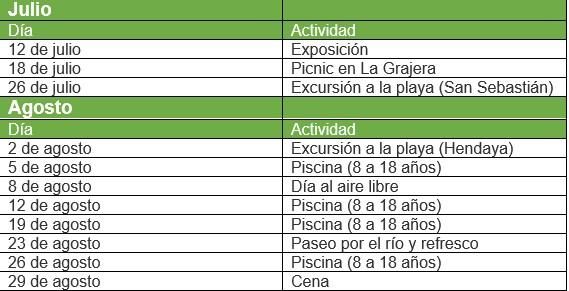 Por un lado, para los más jóvenes se han organizado actividades en la piscina todos los miércoles de agosto. Por otro lado, para los mayores de 18 años, se han organizado excursiones a las playas de San Sebastián y Hendaya, picnics en La Grajera, visitas a exposiciones, una cena, paseos, tomar algo o jornadas al aire libre.
