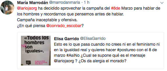 Por todo ello, Podemos propone la retirada de la campaña y su sustitución “por otra nueva que exprese adecuadamente lo que significa el 8 de marzo y por qué es necesario reivindicar el papel de la mujer en la sociedad actual”. Es más, Podemos La Rioja recomienda al Gobierno regional “que se abra a la participación de los colectivos feministas y pida ayuda para comprender algunas claves que al parecer desconocen, incluso podrán aprender que el color que usa este movimiento es el morado y no el rosa”.