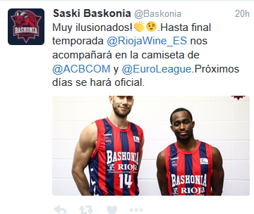 Ha sido el propio equipo el que que ha anunciado, en Twitter, que el logo del vino de Rioja estará en la camiseta del equipo hasta final de temporada en la liga ACB y en la Euroliga.