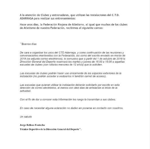 Una decisión que ha sorprendido pero sobre todo enfadado, a padres y entrenadores. Desde hace unos años, recuerda Lozano, los chavales han entrenado siempre los martes y jueves de 18:00 a 19:00 horas. Sin embargo, este año será diferente. Así lo explica una carta del técnico deportivo de la Dirección General de Deporte, Jorge Belloso. De cara a organizar los usos del CTD Adarraga, y como continuación de las reuniones y conversaciones mantenidas con la Federación, explica la carta, así como el escrito enviado en marzo de 2018, la Dirección General del Deporte reservará los martes y jueves de 16:00 a 18:00 a aquellas escuelas de clubes (con niños menores de 12 años) que lo soliciten.