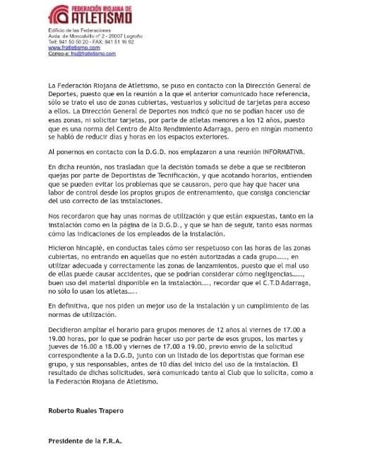 Por su parte, el Gobierno de La Rioja ha puntualizado a Rioja2 que “lo único que se ha hecho es una ordenación de horarios porque estamos hablando de un Centro de Tecnificación en el que entrenan deportistas de alto nivel”. Es más, apostillan, “se mandó una carta a todos clubes explicando los nuevos horarios y, tras la petición de un club, se amplió el horario de entrenamiento los viernes de 17:00 a 19:00 horas”. De hecho, aseveran desde el Gobierno de La Rioja, “a día de hoy no hay ninguna queja ni petición pendiente de aprobar”.