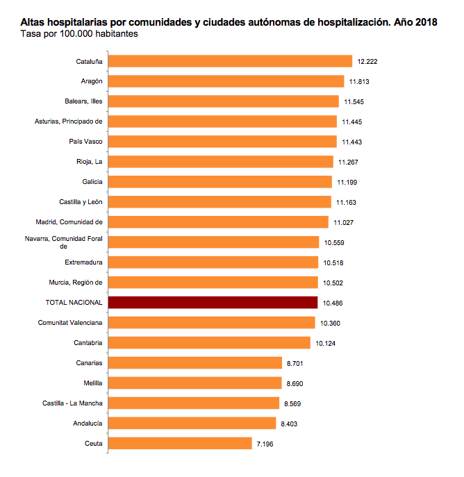Las comunidades con las mayores tasas de altas hospitalarias por 100.000 habitantes en el año 2018 fueron Cataluña (12.222), Aragón (11.813) e Illes Balears (11.545). La Rioja (11.267) es la sexta comunidad con mayor tasa. Por su parte, la ciudad autónoma de Ceuta (7.196), Andalucía (8.403) y Castilla – La Mancha (8.569) presentaron las tasas más bajas.