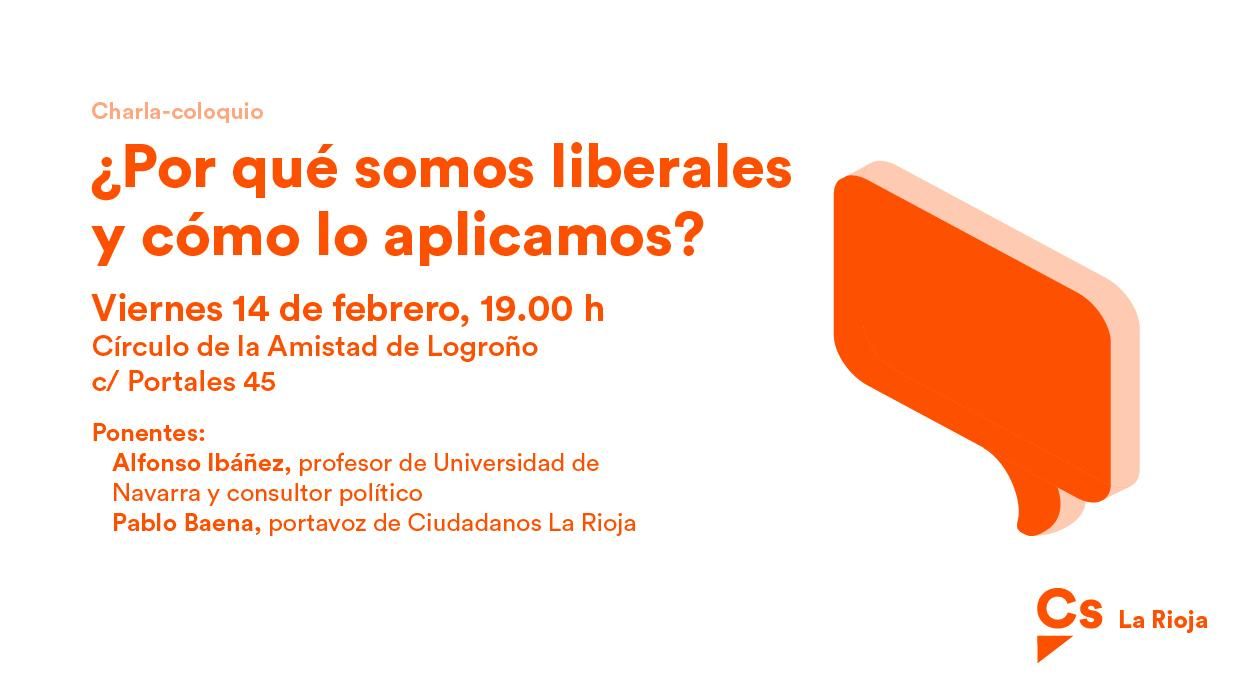 El grupo parlamentario de Ciudadanos (Cs) La Rioja ha organizado una charla coloquio sobre: ¿Por qué somos liberales y cómo lo aplicamos?. El acto tendrá lugar este viernes a las 19 horas en el Círculo de la Amistad (calle Portales 45).