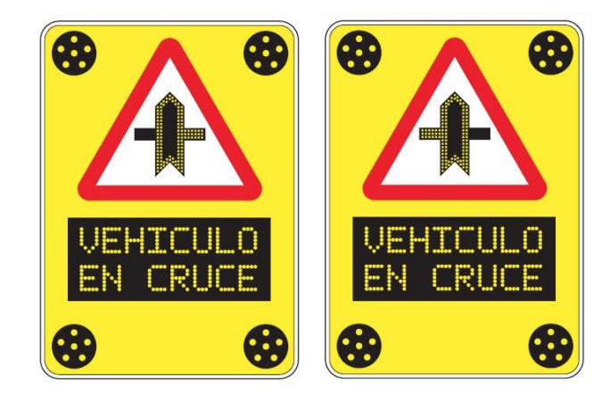 El sistema está formado por dos señales luminosas que cambian en función del tráfico detectado y cuentan con un refuerzo luminoso formado por 4 focos de alta eficiencia de Ø 160 mm y texto de refuerzo “VEHICULO EN CRUCE”.