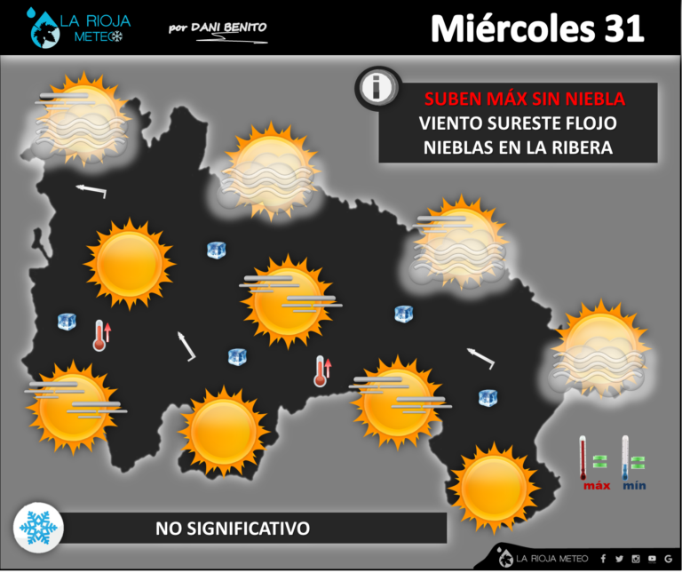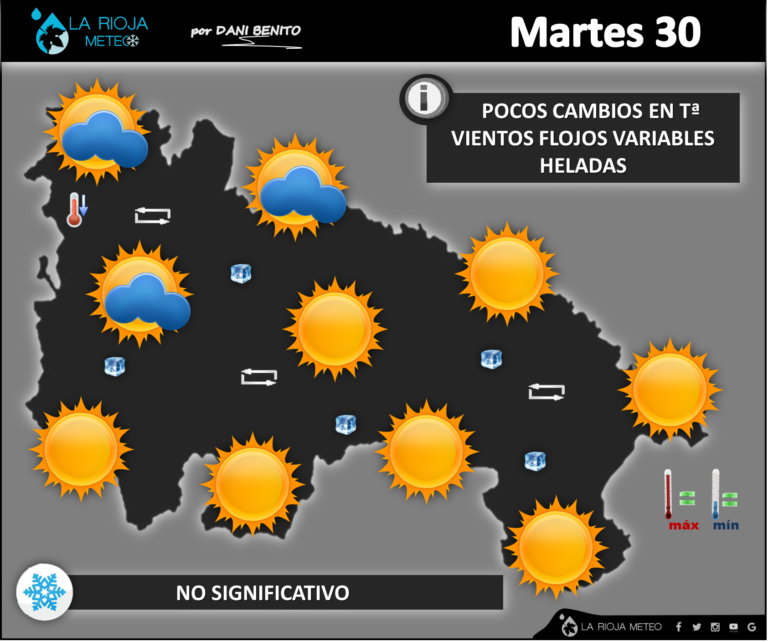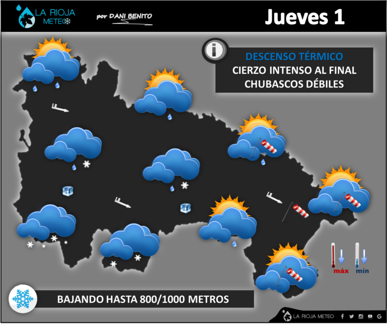 El paso de un frente frío provocará un aumento de nubosidad en toda la región aunque con precipitaciones muy débiles, más frecuentes en la mitad occidental y áreas montañosas donde serán de nieve en cotas de 800/1000 metros. Los vientos rolarán a NorOeste y el Cierzo arreciará por la tarde, especialmente en Rioja baja. Las temperaturas apuntarán hacia abajo, de manera notable en la Ibérica: