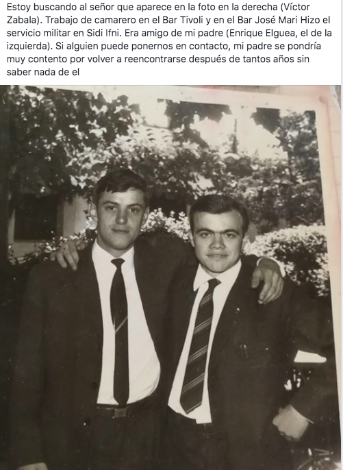 Una joven ha recurrido a las redes sociales en busca de ayuda. Busca a un amigo de su padre, Víctor Zabala, que trabajó como camarero en el Bar Tívoli y en el Bar José Mari e hizo el servicio militar en Sidi Ifni