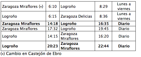 Los nuevos servicios entrarán en funcionamiento en dos días diferentes. El tren Logroño (20:23) – Zaragoza (22:44) iniciará su servicio el domingo 13 de septiembre, y el tren Zaragoza (14:18)- Logroño (16:35) lo hará el lunes 14 de septiembre.