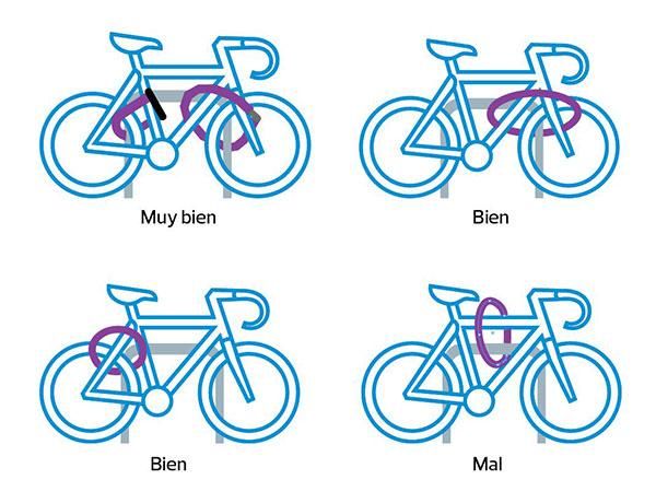 Solicitamos más aparcamientos de bicicletas. El más aceptado y recomendado en Europa por su seguridad y comodidad es el soporte de tipo U-Invertida o sus variantes. La figura muestra la forma correcta de atar la bicicleta al soporte con tu antirrobo: