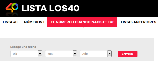 Los 40 principales facilita un buscador que parte del año 1966 y detalla la canción que ocupaba el número uno en su lista de éxitos en la fecha elegida.
