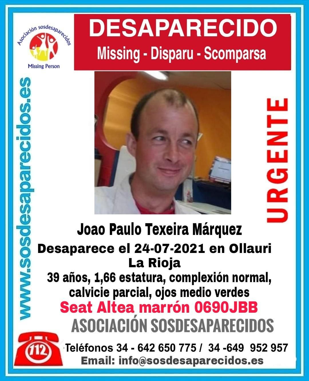 Se busca a un hombre desaparecido el pasado sábado, 24 de julio, en Ollauri. Se trata de Joao Paulo Texeira Márquez, de 39 años. Mide 1,66 metros, tiene una complexión normal, calvicie parcial y ojos medio verdes.