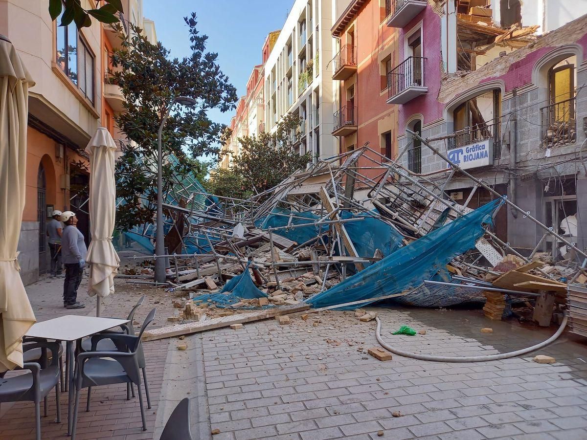 Susto importante esta mañana en el centro de Logroño. Un andamio de una obra en la calle María Teresa Gil de Gárate se ha derrumbado por completo, así como parte de la fachada del edificio sobre el que estaba colocado el andamio.