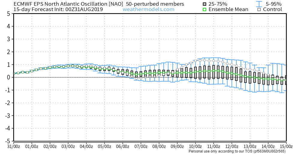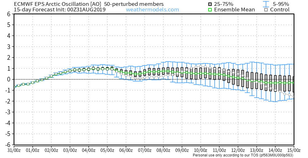 En el EPS de los 50 miembros (o posibles escenarios) que baraja el modelo Europeo, observamos que los valores NAO continuarán en valores neutros o ligeramente positivos durante esta primera quincena del mes, lo que nos podría indicar que la circulación de Oestes poco a poco iría rearmándose en el Atlántico Norte, mientras que en el Atlántico más meridional las altas presiones ganarían poco a poco terreno, con un Azoreño relativamente potente. No obstante dada la falta de significación del índice hace valores marcados, no sería de extrañar la aparición de situaciones intermedias y posibles migramientos de las altas hacia el norte, al encuentro con un intermitente anticiclón groenlandés. Algo que también vendría avalado por un índice AO que se movería en valores neutros o ligeramente positivos.