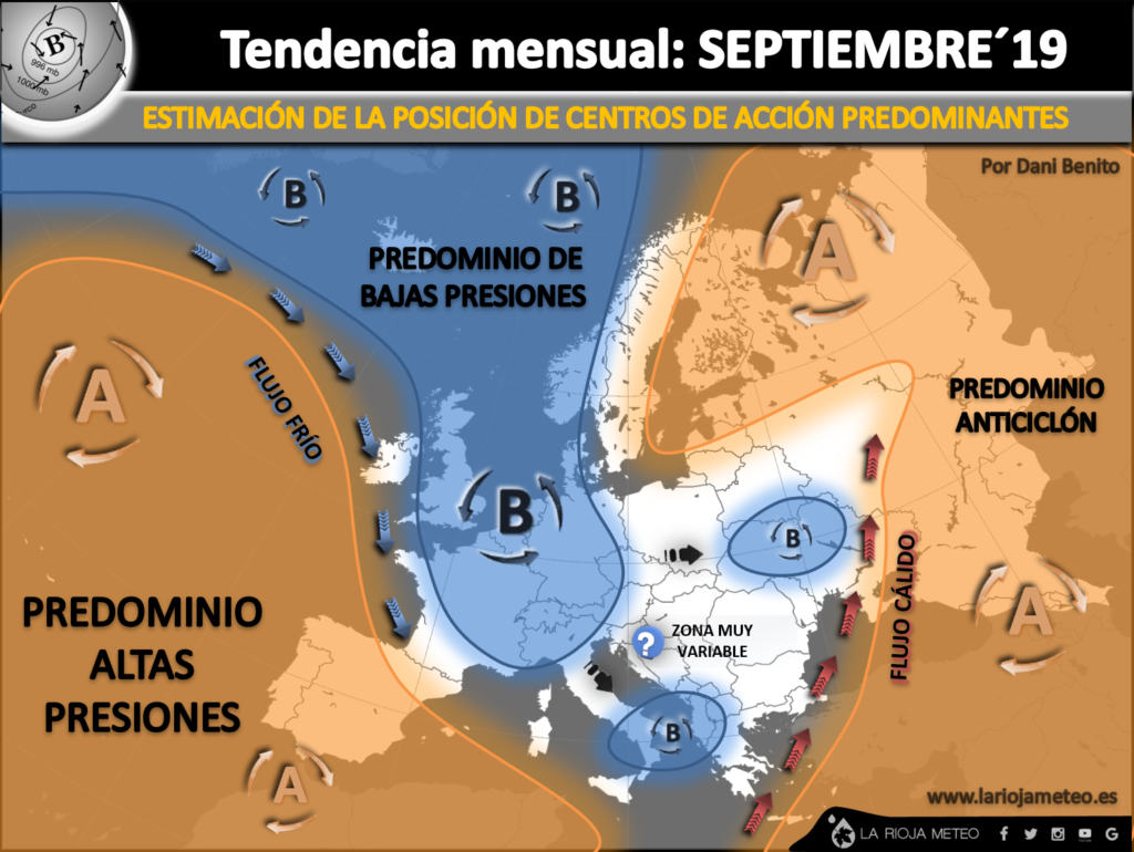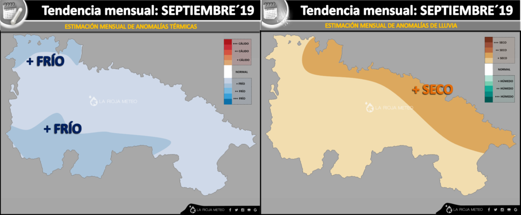 En base a los modelos experimentales climáticos basados en el CFS y ECMWF, esperamos en La Rioja un mes de septiembre más frío y seco de lo normal. Aunque la entrada de nortes pueda traernos algo más de humedad en la Ibérica, poco esperamos en el valle. Respecto a las temperaturas se esperan más bajas de lo normal en toda la región, especialmente en la ribera.