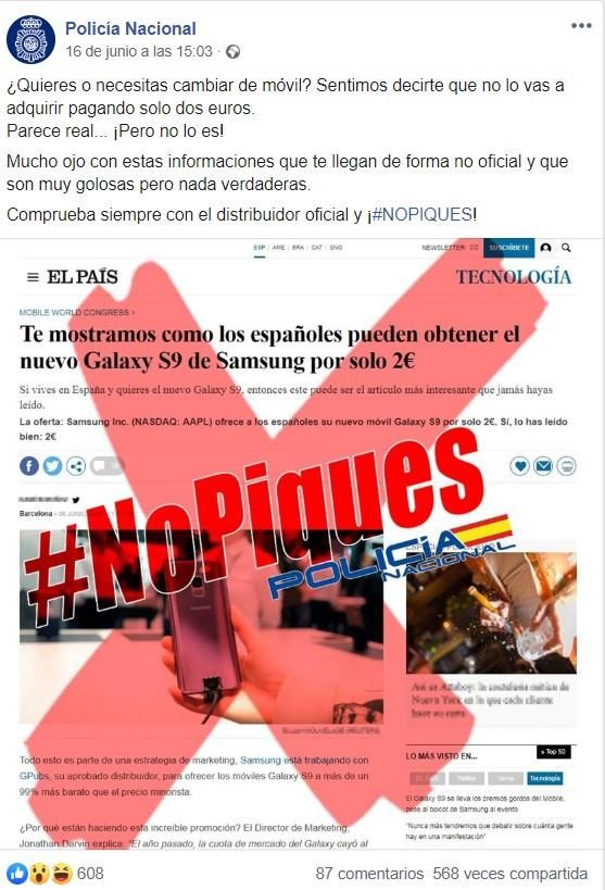 Esta vez, se trata de una “oferta” en la que “puedes adquirir el nuevo Samsung Galaxy por solo 2 euros”, tal y como detalla Policía Nacional, “la información parece real pero no lo es”.