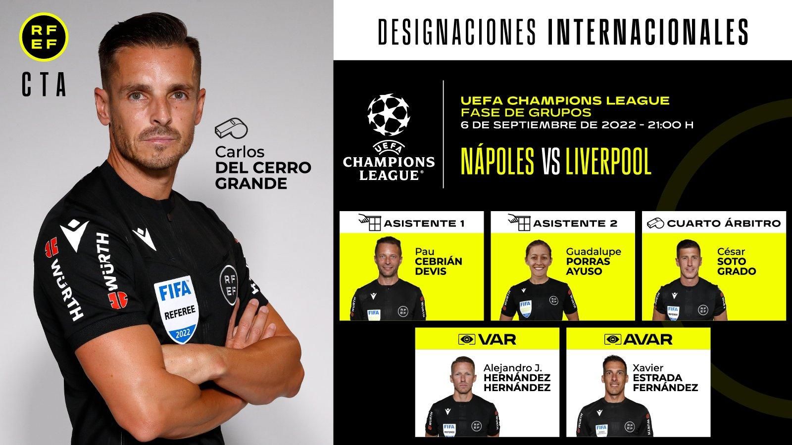 La Real Federación Española de Fútbol se ha hecho eco este lunes de la designación de César Soto Grado como cuatro árbitro para el partido de Champions que enfrenta al Nápoles contra el Liverpool en el Diego Armando Maradona el miércoles a las 21:00. En el contexto de la primera jornada de la fase de grupos del certamen, el colegiado del comité riojano estará presente en el duelo del Grupo A.