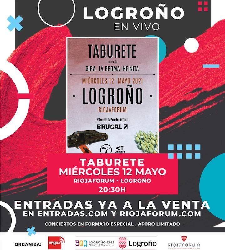 El grupo Taburete actuará en Logroño el próximo 12 de mayo. La cita será en Riojaforum a las 20:30 horas. El aforo será limitado y las entradas ya están a la venta en www.entradas.com y en www.riojaforum.com, a un precio de 35 o 45 euros.