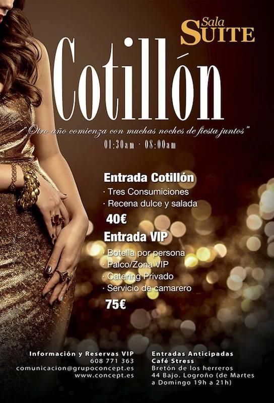 Un clásico de estas fechas son los cotillones en discotecas. En Logroño, la sala Concept (Duquesa de la Victoria, 8) es una de las que ofrece una fiesta por todo lo alto para comenzar el año, desde la 1:30 horas, por 3 consumiciones por 40 euros o entrada VIP por 75 euros.