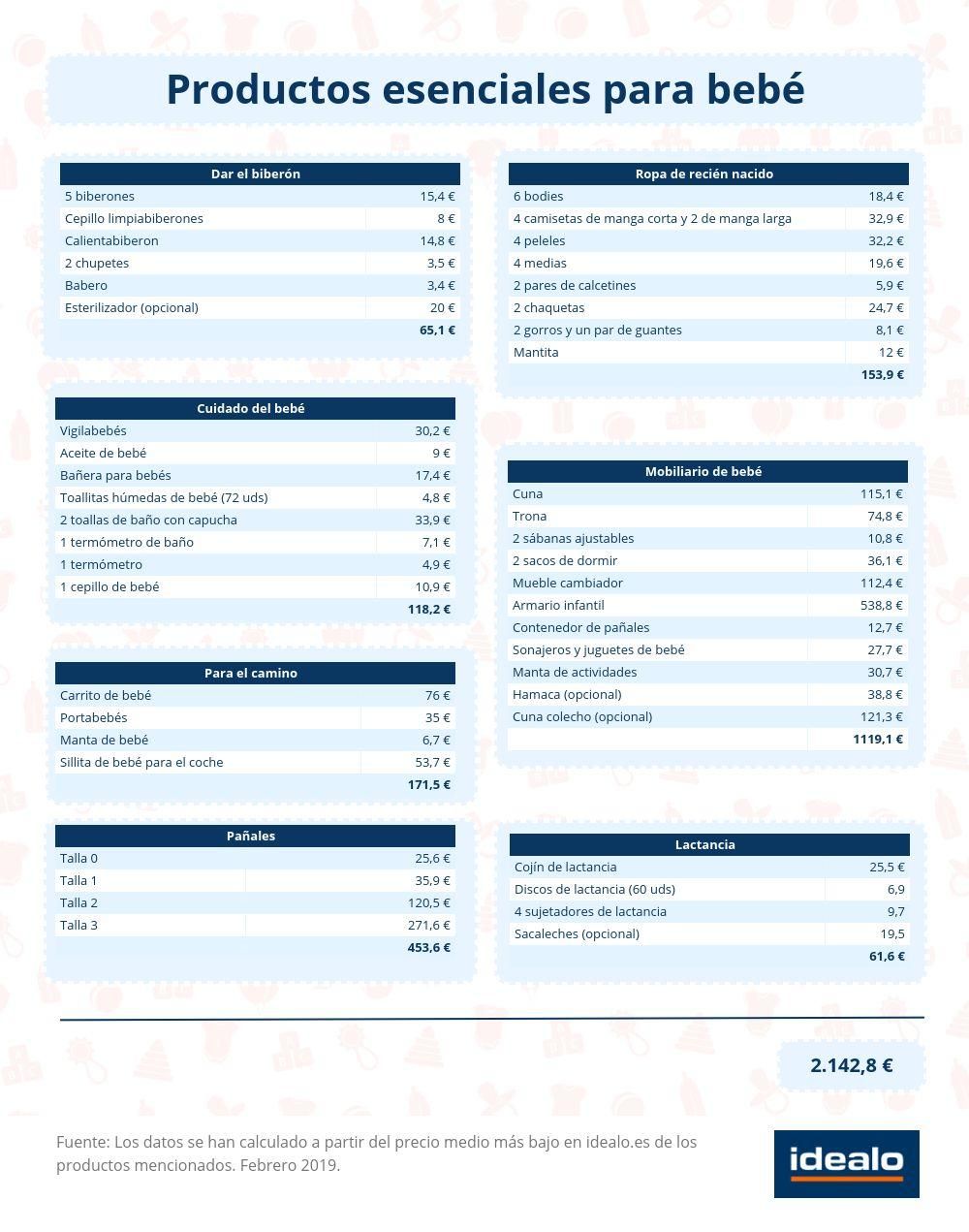 Las categorías que han subido más de precio en los últimos dos años son los productos de lactancia y el mobiliario. Los productos de lactancia, que incluyen cojines de lactancia, discos de lactancia, sujetadores de lactancia y sacaleches, han subido un 62 %. En cuanto el mobiliario, el coste incluiría la cuna, sábanas, sacos para dormir, la trona, el mueble cambiador, un armario infantil, la cuna de colecho, un contenedor de pañales, la hamaca, una manta de actividades, el sonajero y juguetes de bebé. Estos elementos han experimentado una subida de un 46,3 % de media frente a 2016, alcanzando los 1.119,1 euros.