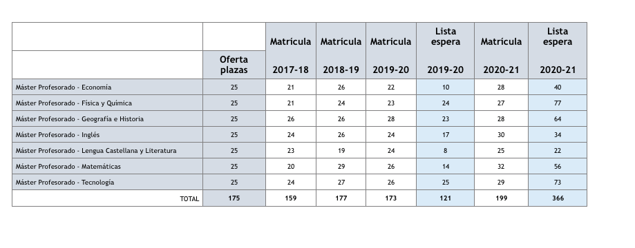 Este máster oferta en la UR 175 plazas, 25 por cada especialidad (Economía, Física y Química, Geografía e Historia, Inglés, Lengua Castellana y Literatura, Matemáticas y Tecnología). Si el curso pasado se matricularon 173 alumnos y 121 se quedaron en lista de espera, este año se han matriculado 199 (alguno procedente del curso anterior) y se han quedado a la espera 366, el triple que en el curso 2019-2020.