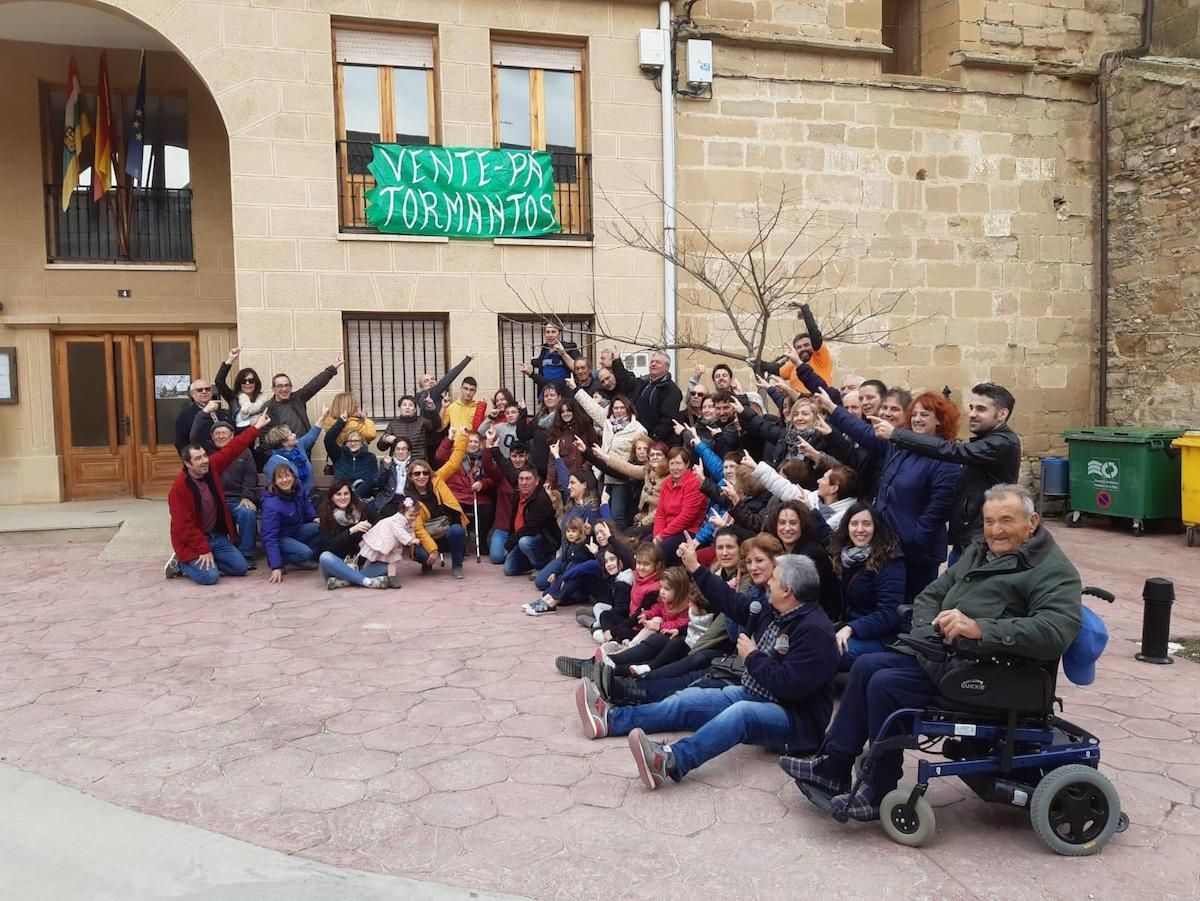 La plaza de Tormantos se llenó este sábado de vecinos para gritar para pedir la repoblación de su pueblo. El mensaje se podía leer en una pancarta que habían colocado en el balcón del ayuntamiento: “Vente pa Tormantos”.
