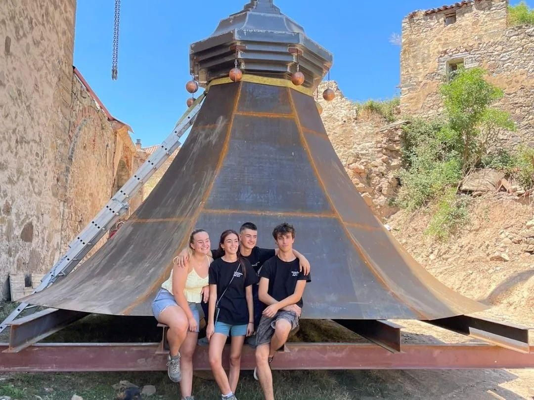 Fue el pasado martes cuando la aldea celebró la colocación de las nuevas cúpulas en su iglesia de San Martín. “La subida fue muy rápida, la agarraron sin problemas, la que dio más problema fue la del campanario, costaba casarla y para subirla había poco espacio y había que hacer maniobras, ayudó todo el que estuvo viendo a subirla con una cuerda, para que no se diera contra la pared”, agradece Lucía Olivas, presidenta de la asociación Virgen de Serrias.