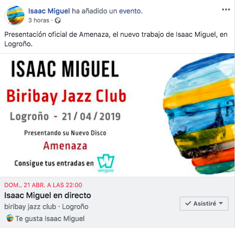 Y un anuncio. Y es que el músico riojano Isaac Miguel ya tiene fecha de presentación de su último trabajo, Amenaza. Será el 21 de abril en el Biribay Jazz Club. ¿Te animas?