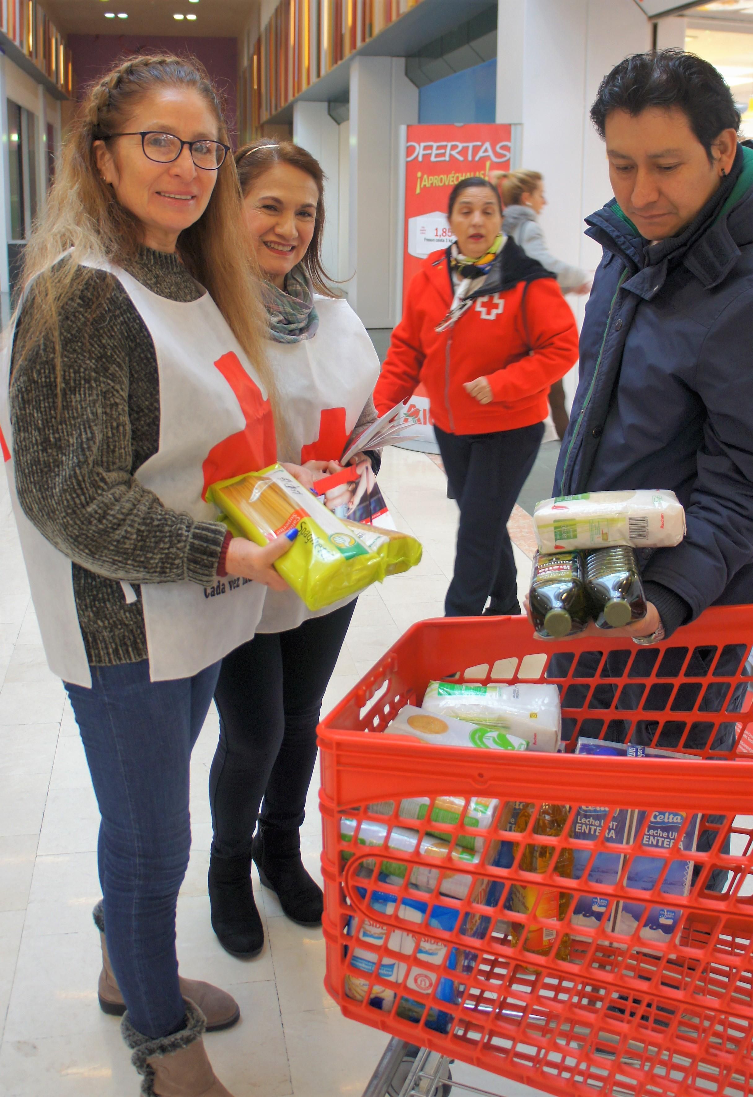 80 voluntarios de Cruz Roja están recogiendo de manos de los ciudadanos productos como leche, zumo, galletas o cereales para entregar a familias en situación de necesidad de los municipios del entorno de cada supermercado.