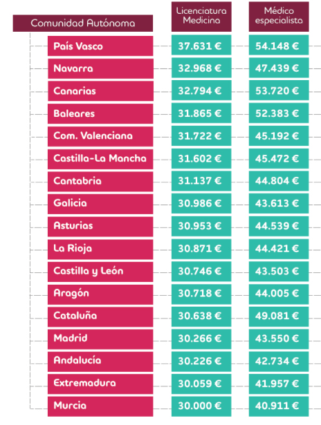 En la parte alta del ranking, encontramos a los doctores navarros y los canarios, aunque las diferencias son mayores entre los especialistas que entre los licenciados sin especialidad.