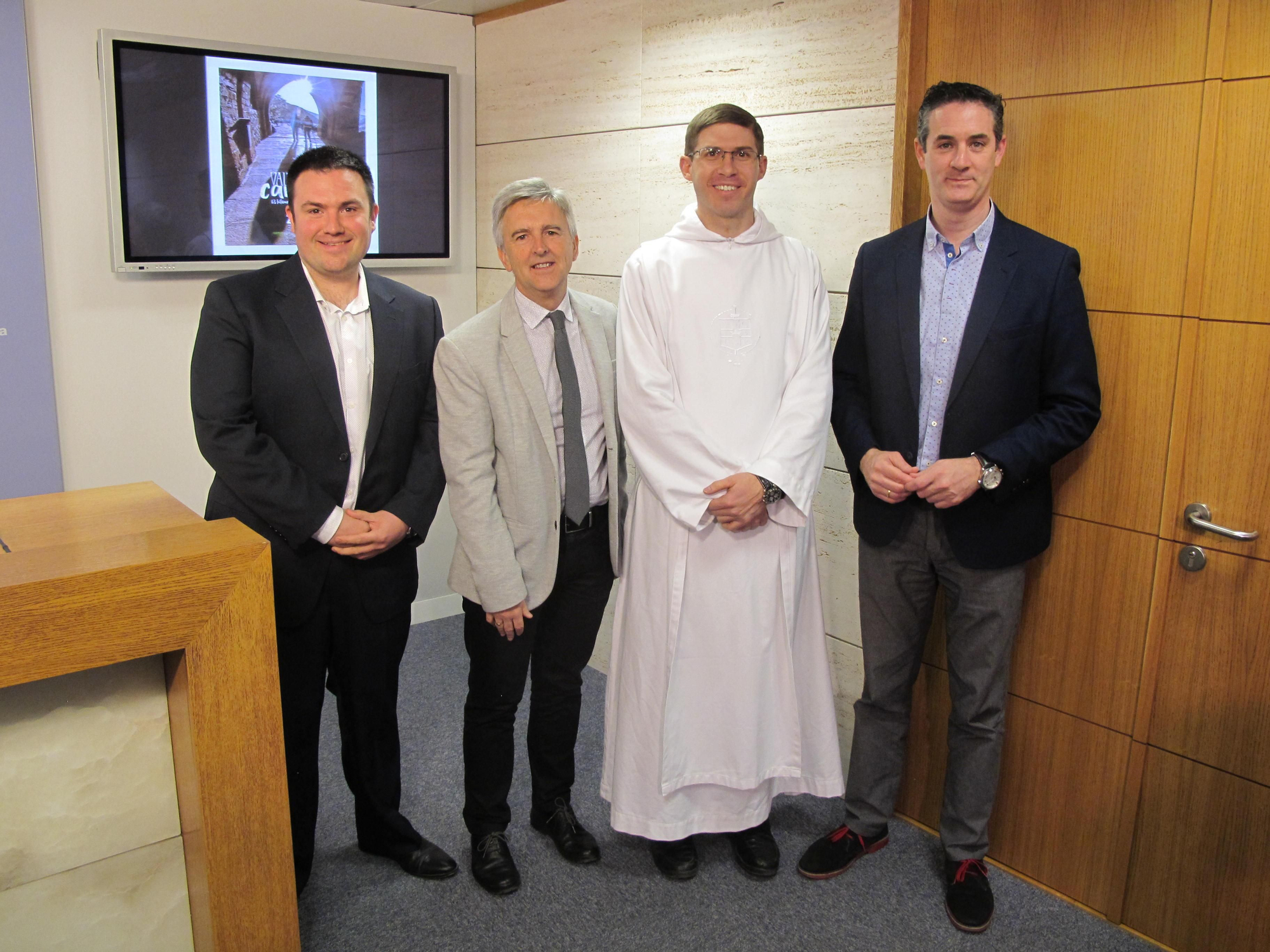 Los directores generales de Cultura y Turismo, Eduardo Rodríguez Osés, y del Deporte y del IRJ, Diego Azcona, acompañados por el Prior del monasterio de Valvanera, Agustín María Prado, y el coordinador de la romería, Santiago Ruiz, han presentado hoy la romería ‘Valvanera Camina’, que partirá de Logroño el 4 de mayo y llegará al Monasterio el día 5.