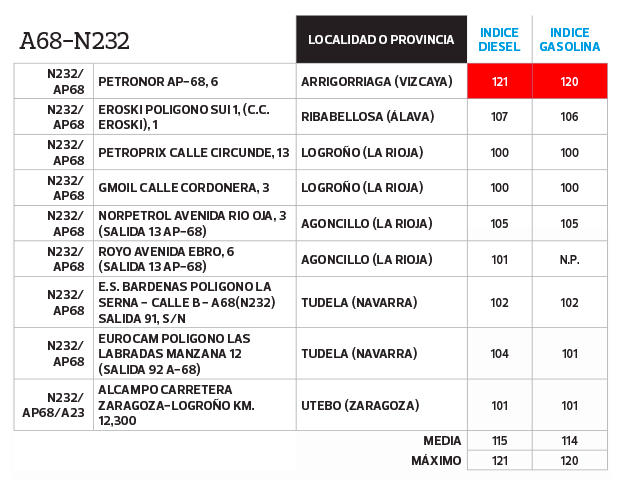 El estudio también incluye las gasolineras de las radiales A1, A2, A3, A4, A5 y A6; las costeras A7-AP7-N340 (la del Mediterráneo); la A8-AP8-N634 (la del Cantábrico); la AP9-N550 (la de las rías gallegas); la A62 (del País Vasco a Portugal) la ruta de la Plata A66, y A23y N234.