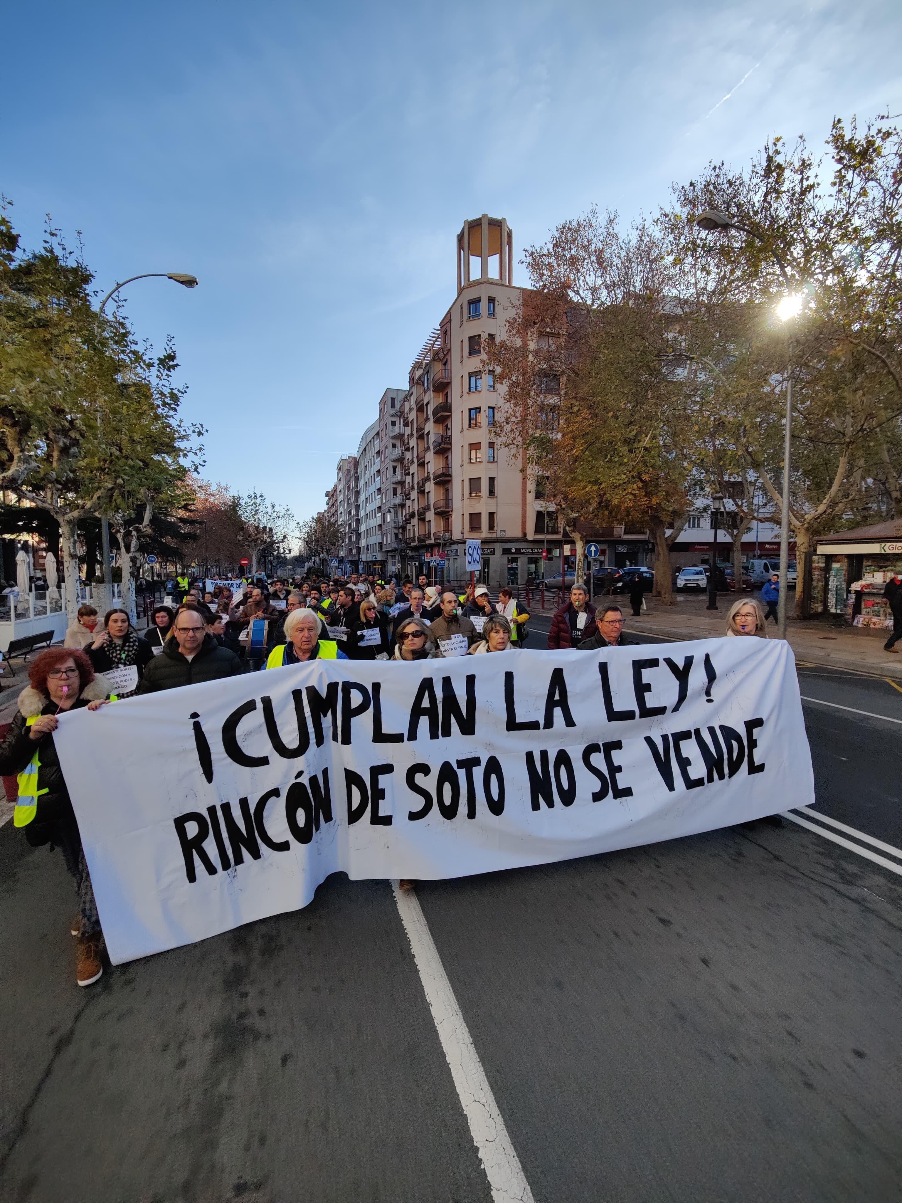 La misma ha ido encabezada por un 'trenecito' a la que seguían los 'rinconeros' con una pancarta principal en la que se leía '¡Cumplan la Ley! Rincón de Soto no se vende'. Además han portado otras, así como carteles, que indicaban 'Stop a la Variante Norte'; 'Si, a la voz de Rincón'; 'Rincón Unido, no a la variante Norte. No por lo mejor de Rincón. Perdemos Todos' o 'Diálogo si, imposición no'.