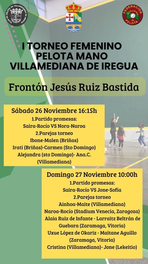 La Federación Riojana de Pelota se ha hecho eco del I Torneo de Pelota a Mano Femenino que se va a celebrar a partir de este fin de semana en Villamediana de Iregua. Los partidos se disputarán en el Frontón Jesús Ruiz Bastida. La programación del sábado 26 arrancará a partir de las 16:15 y, el domingo 27, a partir de las 10:00.