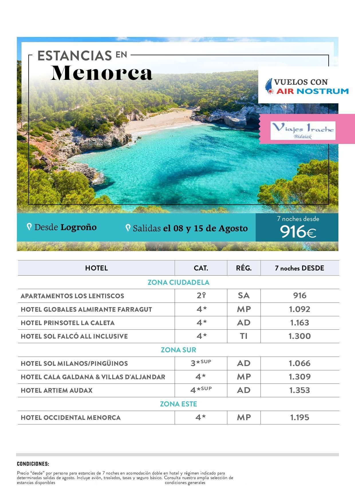 La operadora Viajes Iratxe acaba de anunciar dos nuevos vuelos cárters con salida desde el aeropuerto de Logroño-Agoncillo. Esta vez el destino será la isla de Menorca y las fechas de salida serán el 8 y el 15 de agosto. La vuelta será ocho días después de estas dos fechas. Serán operados por Air Nostrum y el horario de despegue desde Logroño será a las 15 horas y la vuelta desde Mahón a las 11,50 horas.