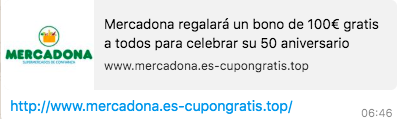 Ahora se está divulgando el mensaje por WhatsApp, con apariencia real ya que la dirección de enlace es de la propia web de Mercadona. Pero que nadie caiga: es falso.