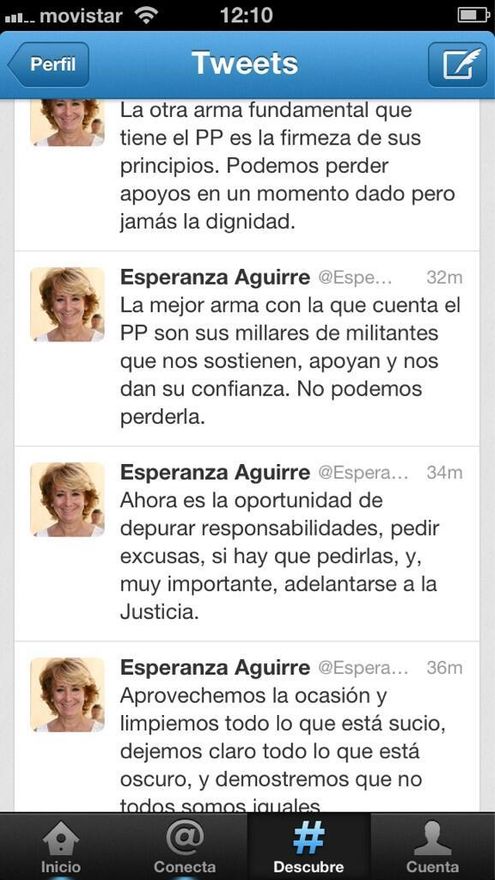 ¿Todos? No. Una vez más, Esperanza Aguirre se mueve por su cuenta. Después de su discurso de ayer en la Junta directiva del PP madrileño, hoy se ha levantado con ganas de seguir la guerra por su cuenta. Ha publicado la intervención en su blog y ha lanzado una batería de tuits.