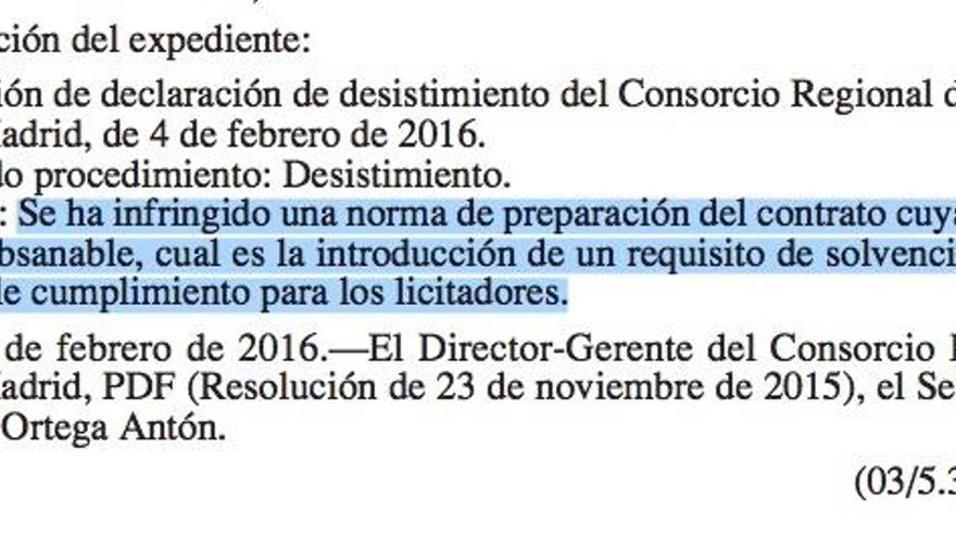 En febrero de 2016, el gerente del Consorcio, José María Ortega, desistió del concurso argumentando que se había “infringido una norma cuya reparación no es subsanable: la introducción de un requisito de solvencia técnica de imposible cumplimiento para los licitadores”. La venta del billete turístico cesó - más allá de la red propia del CRTM - y el concurso no se volvió a convocar.