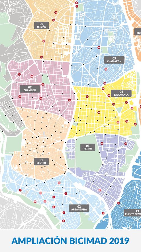 En Retiro habrá 3 nuevas estaciones, situadas en la zona este del parque, densifican el servicio que prestado actualmente por 22 estaciones. Ciudad Lineal se estrena en BiciMAD con 2 estaciones que sobrepasan la M-30. En Puente de Vallecas se implanta una estación que sobrepasa la M-30 y da servicio al área intermodal de Puente de Vallecas.