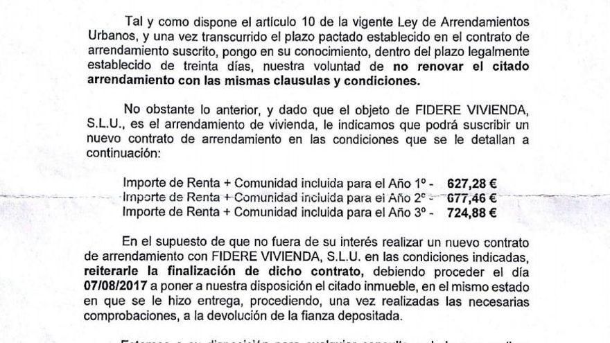 A Chus le va a cumplir en poco tiempo el contrato y Fidere le hará una nueva subida si quiere quedarse otros tres años. Cada trienio, más dinero. Ya sabe que no firmará, como han hecho otras vecinas, que han empezado a abonar la mensualidad en el juzgado para evitar el desahucio por impago. Beatriz, Arancha, Ana, Irene y Conchi repiten esta operación cada mes desde agosto de 2017. La subida que les exigen llega al 50%. Beatriz, por ejemplo, pagaba 290 euros y ahora le piden 725. El aumento durante los tres años de contrato es progresivo: un 9,75% el primero, un 18,45% el segundo y un 18,45% el tercero.